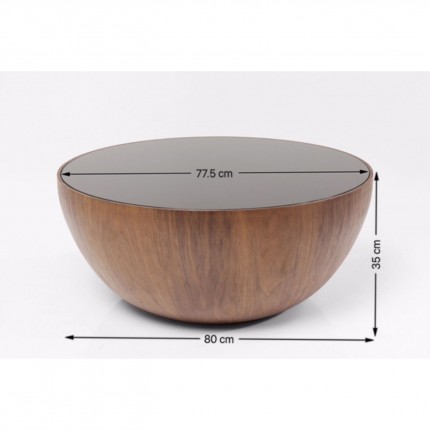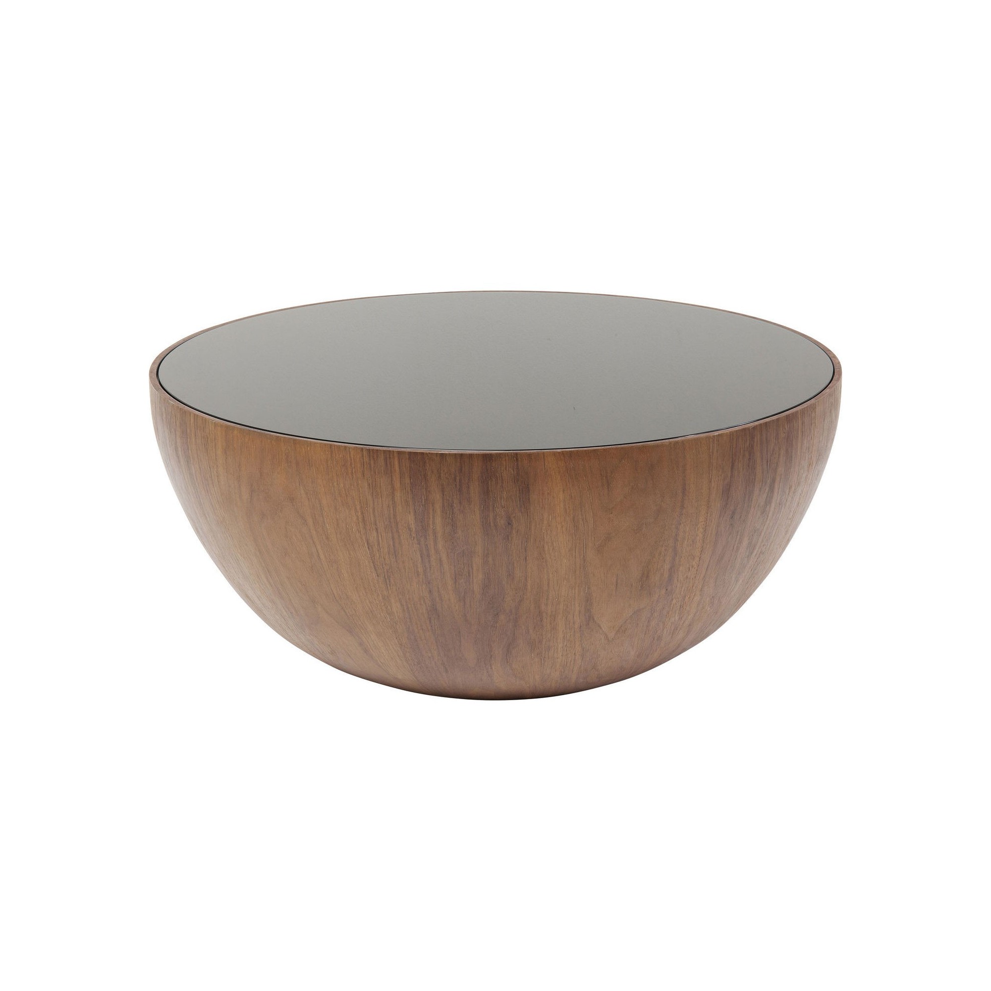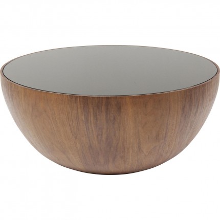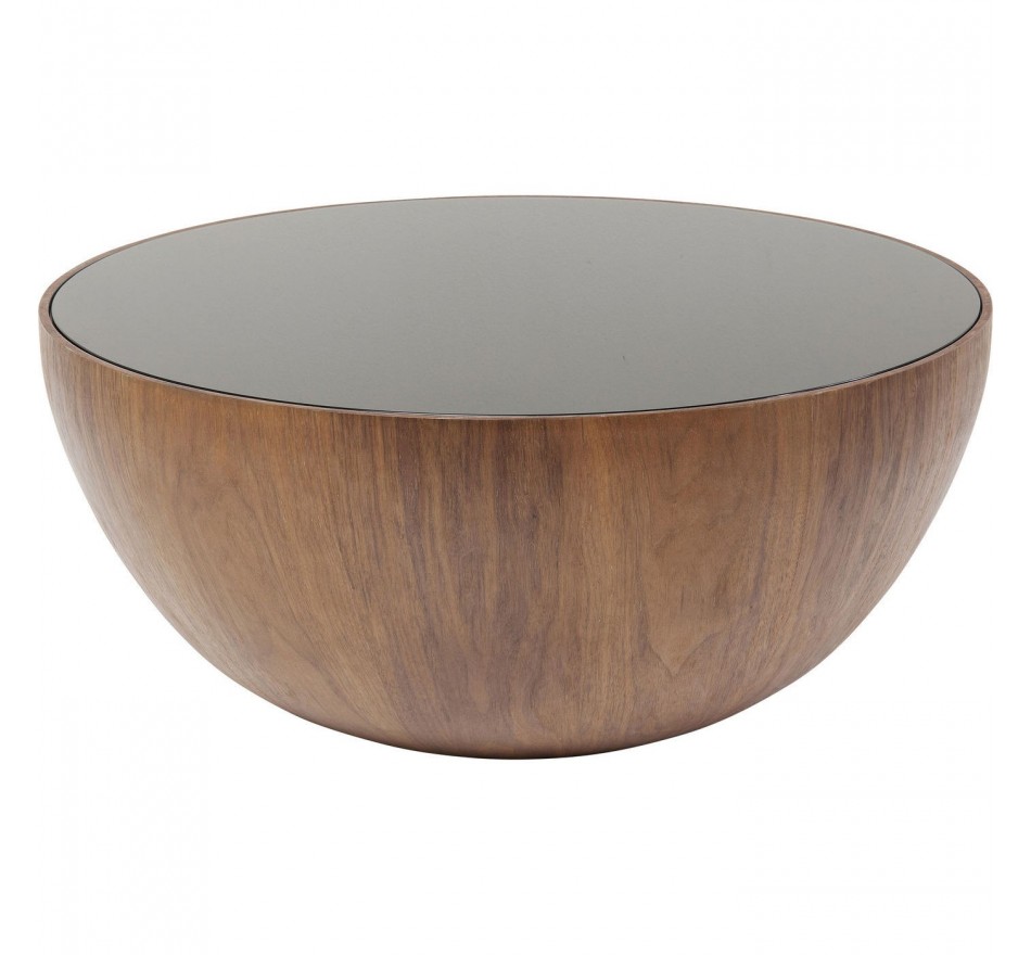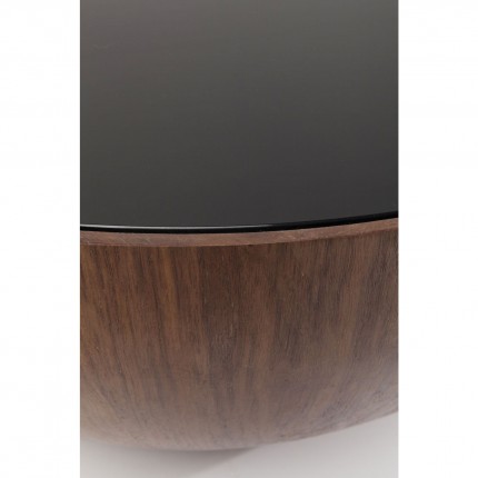 Deze pure, komvormige salontafel heeft een spel van materialen en kleuren tussen het bruine walnotenhouten oppervlak en het glanzend zwarte glazen blad. Het resultaat is een strak, minimalistisch geheel.