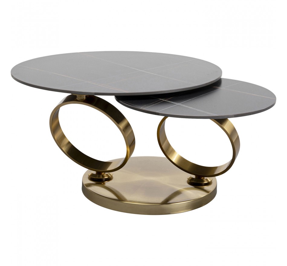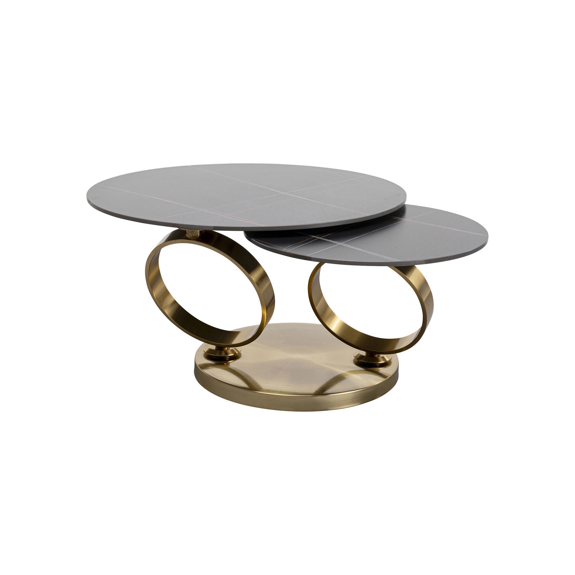 Met zijn luchtige ontwerp belichaamt deze salontafel de perfecte balans tussen elegantie en moderniteit. De ronde vormen komen samen in een harmonieus samenspel van rondingen, terwijl de stalen structuur een vleugje karakter en verfijning toevoegt. De twee draaibare bladen bieden praktische flexibiliteit, zodat je het oppervlak kunt aanpassen aan je wensen en huidige behoeften. Het is een echt middelpunt van de woonkamer en betovert met zijn grafische allure en intelligente functionaliteit.