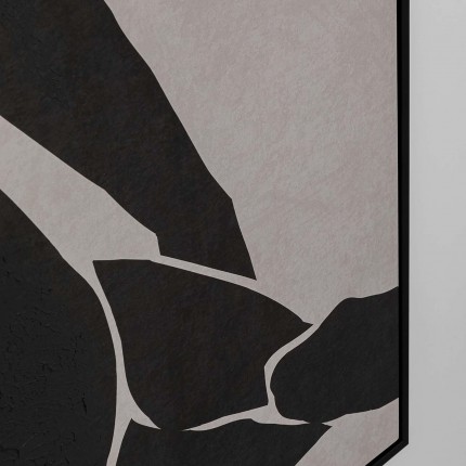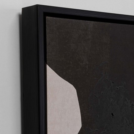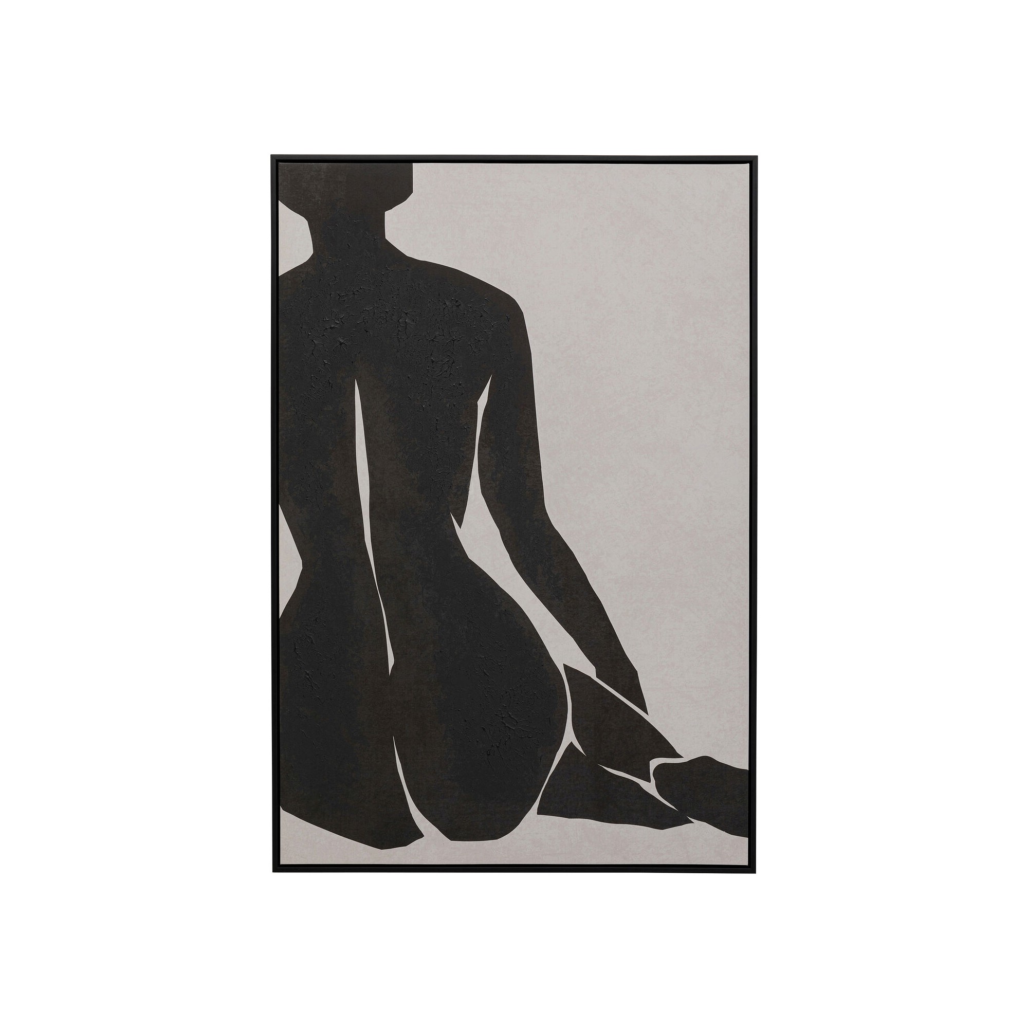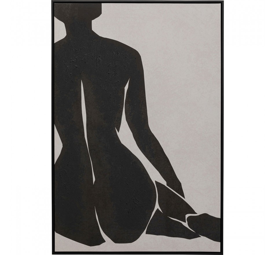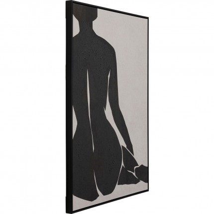 Dit duochrome schilderij op canvas benadrukt de rondingen van een zittende vrouw van achteren gezien. De getextureerde details op het zwart herinneren ons eraan dat geen enkel lichaam perfect is.