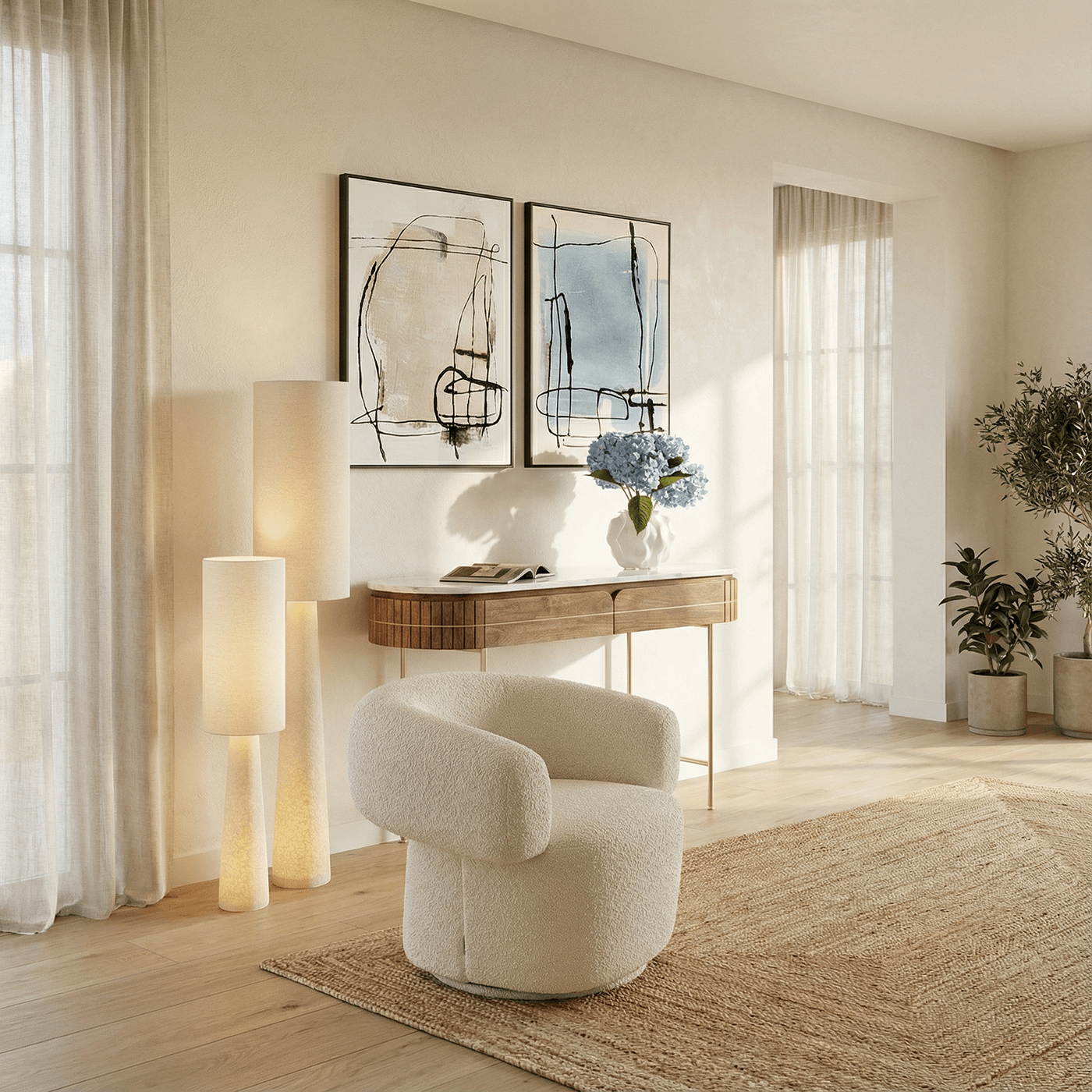 Dit abstracte schilderij valt op door de serene, rustgevende tinten, terwijl de vloeiende zwarte lijnen dynamiek toevoegen.