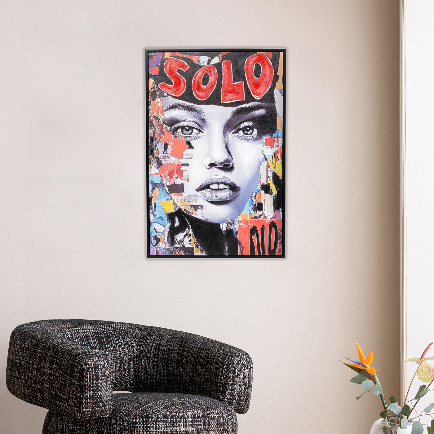 Een gedurfd schilderij dat stedelijke energie combineert met redactionele stijl. Het vrouwenportret in grijs en zwart in contrast met effen kleuren zorgt voor een opvallend werk.