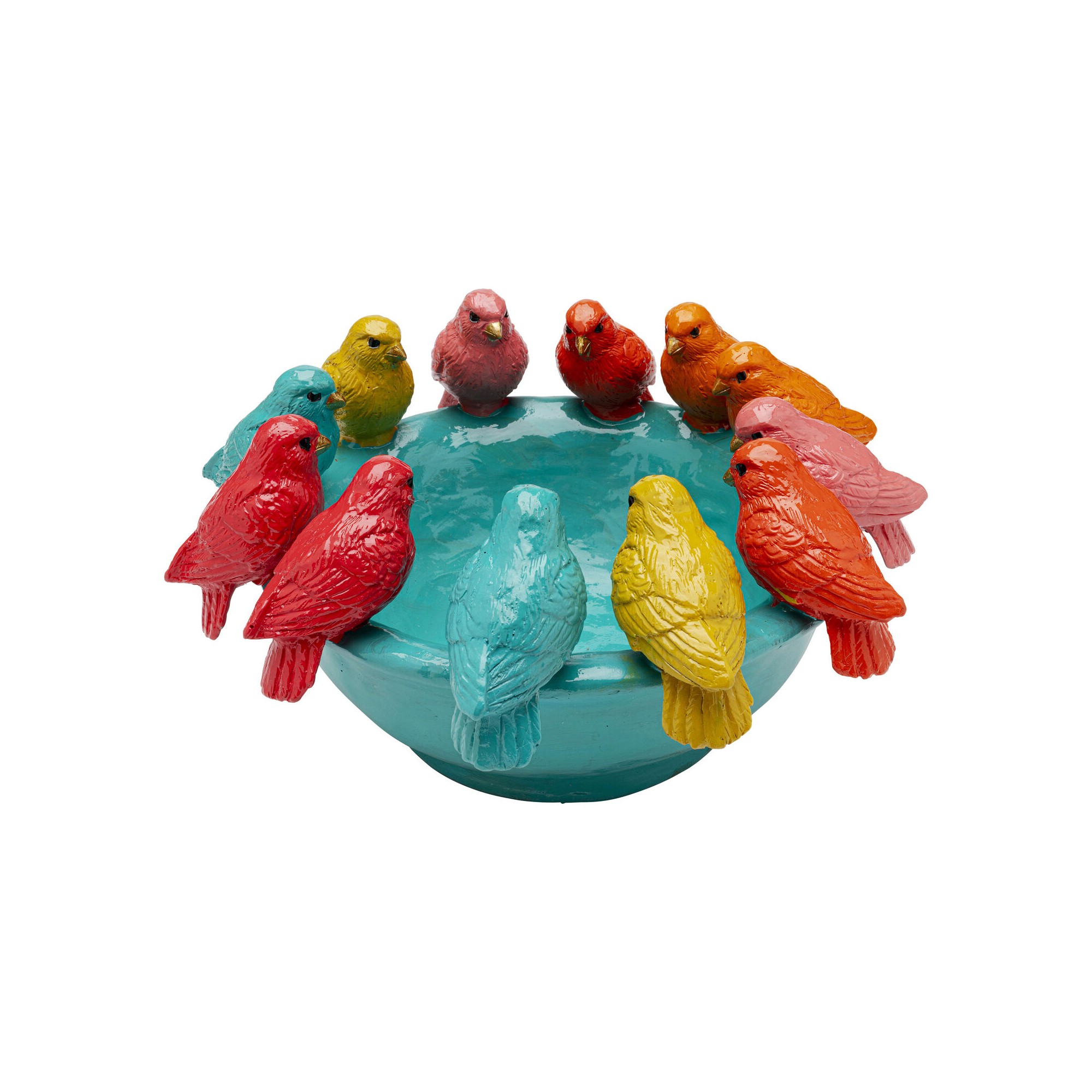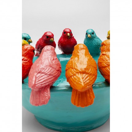 Een veelheid aan kleurrijke vogeltjes nestelt zich rond deze blauwe schaal, alsof ze ervan willen drinken of met elkaar willen kletsen. Ideaal om een vleugje fantasie toe te voegen aan je inrichting.