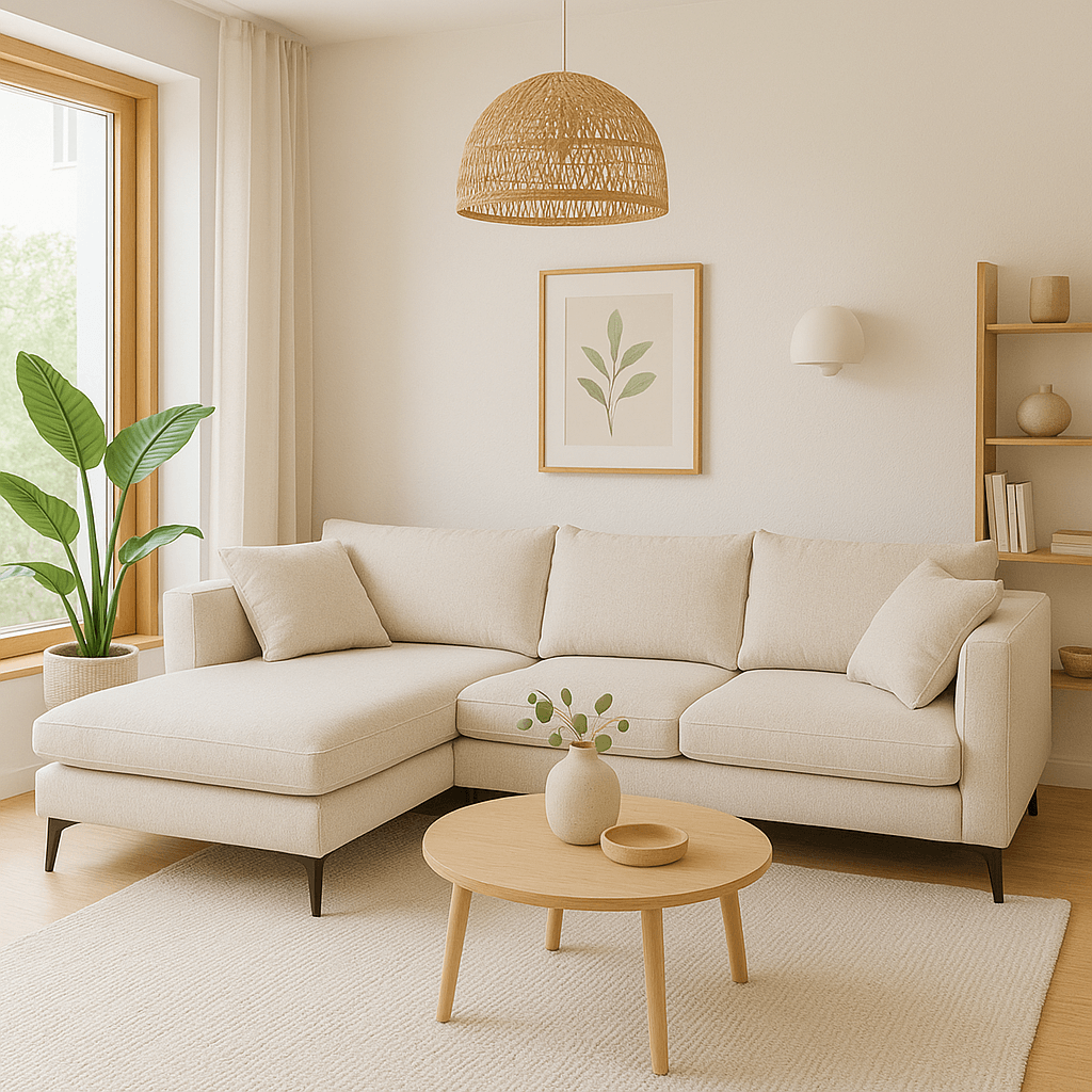 Deze hoekbank met zijn crèmekleurige geweven stof zal de finishing touch geven aan je gezellige inrichting.