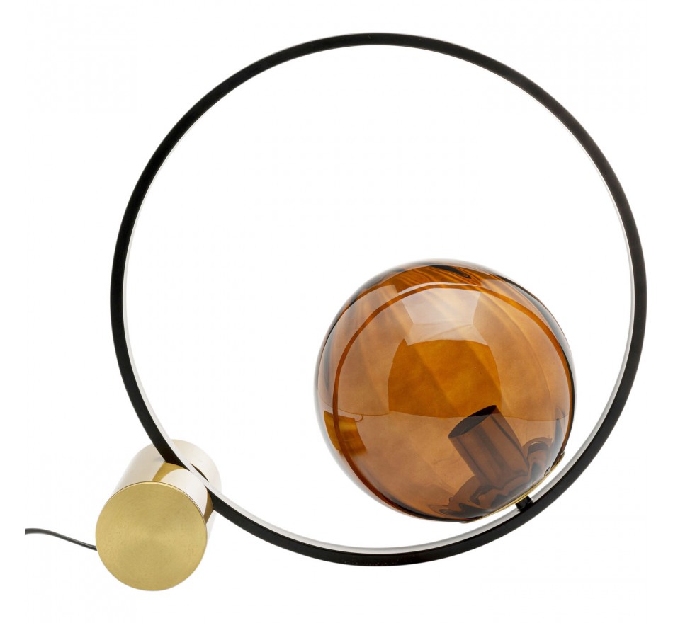 Laat je verleiden door deze gedurfd vormgegeven lamp: een zwarte stalen cirkel herbergt een bruine glazen bol, waarin de lamphouder verborgen zit. Het geheel wordt op zijn plaats gehouden door een gouden cilindervormige voet die het geheel in evenwicht houdt.