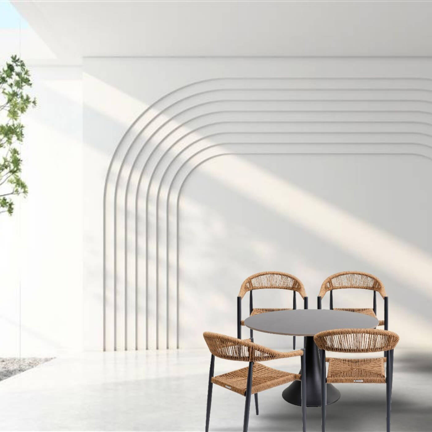 Deze ronde Grande Possibilita eettafel combineert eigentijds design en functionaliteit met zijn tulpvormige poot van gepoedercoat aluminium en het stevige, onderhoudsvriendelijke blad van ruwe zandsteen, elk model met unieke ribbels. Om je ruimte compleet te maken, bieden onze Palma buitenstoelen lichtheid, waterbestendigheid en ergonomisch comfort, ideaal om volop van de zon te genieten in je tuin, op je terras of bij het zwembad.