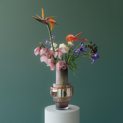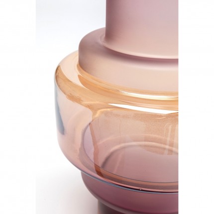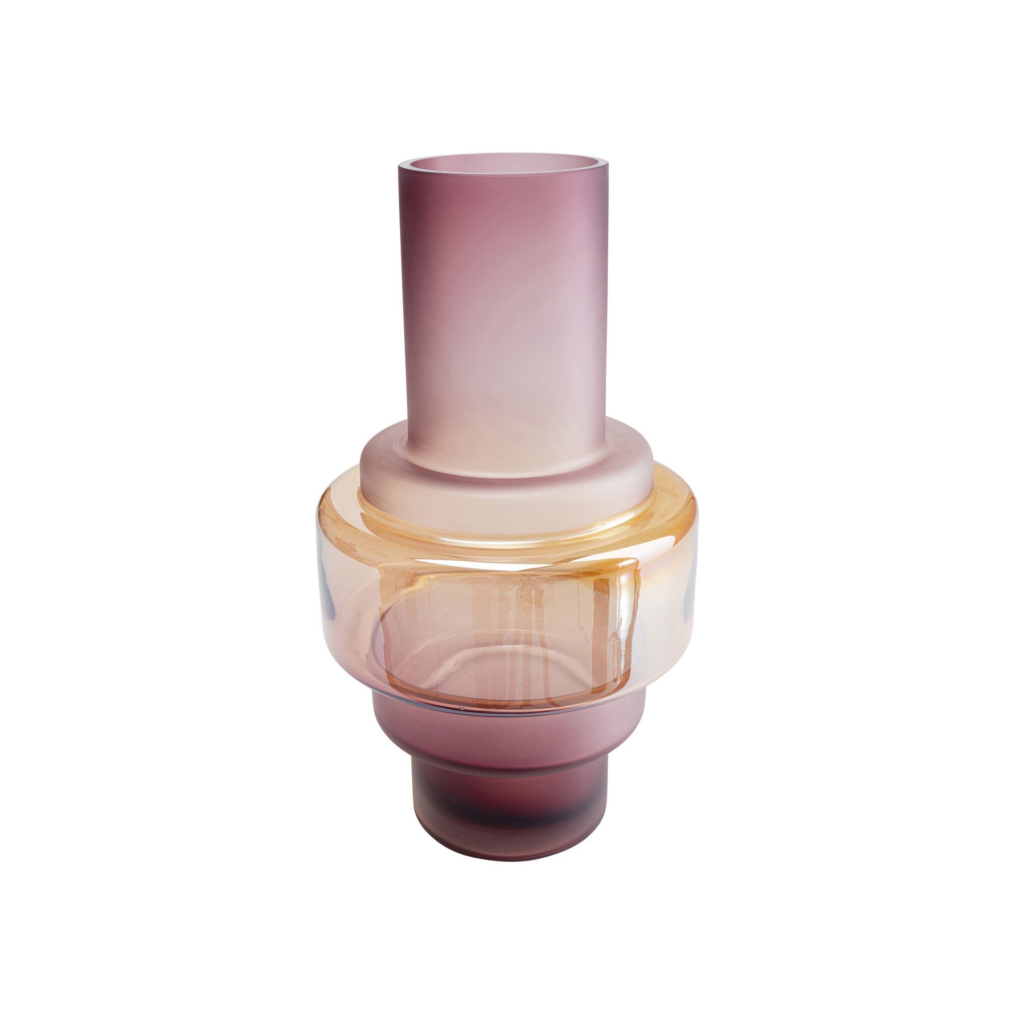 Deze glazen vaas speelt met licht en nuance. De rokerige roze gradatie gaat over in amberkleurige transparantie. Een elegant en eigentijds stuk.