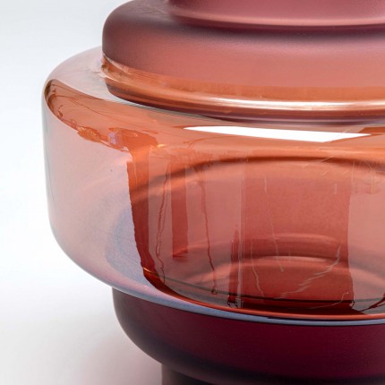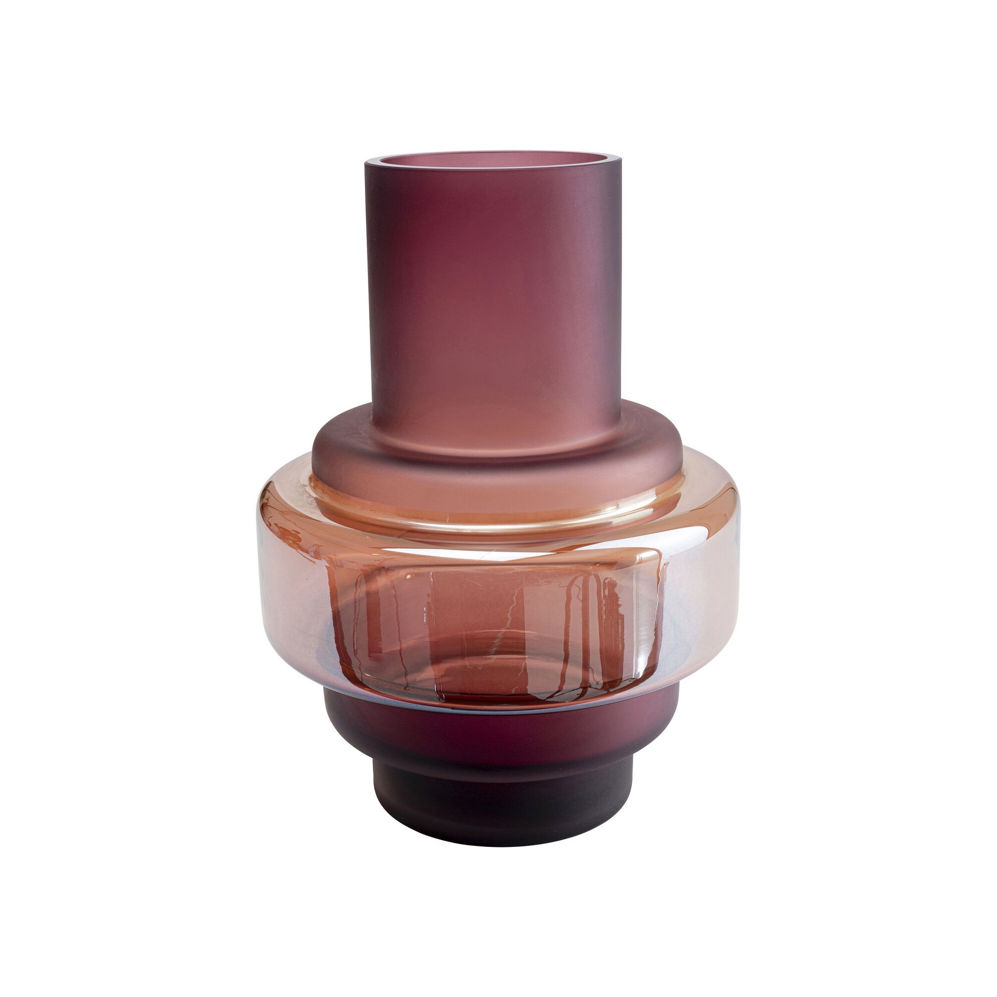 Deze vaas speelt met kleur en afwerking met zijn combinatie van mat roze-paars en transparant ambergeel.