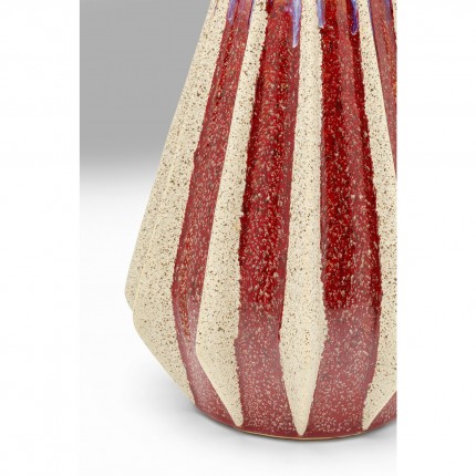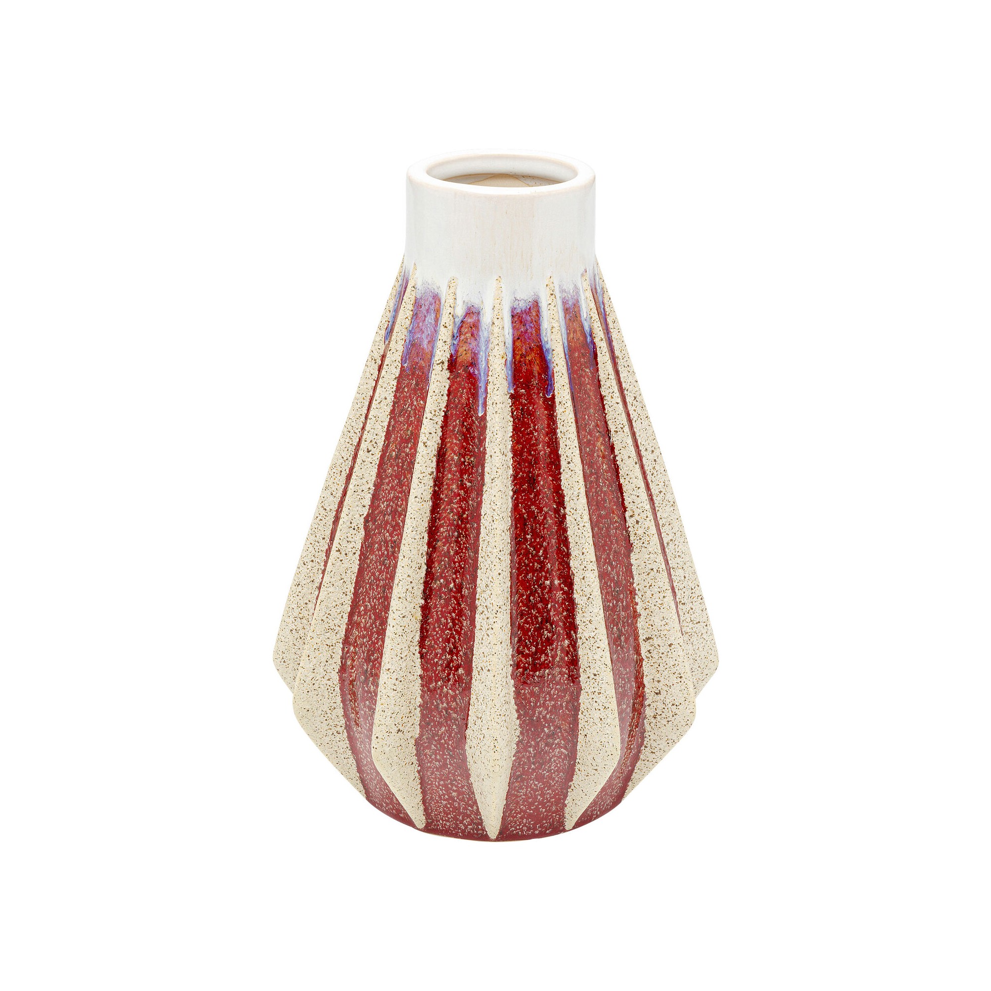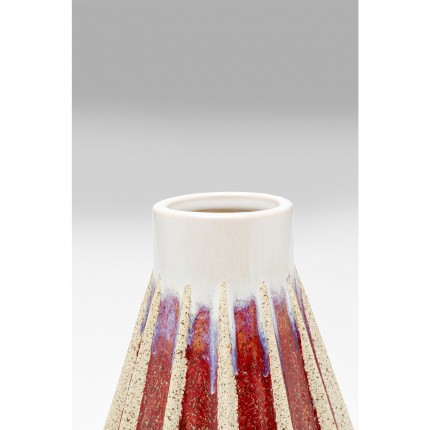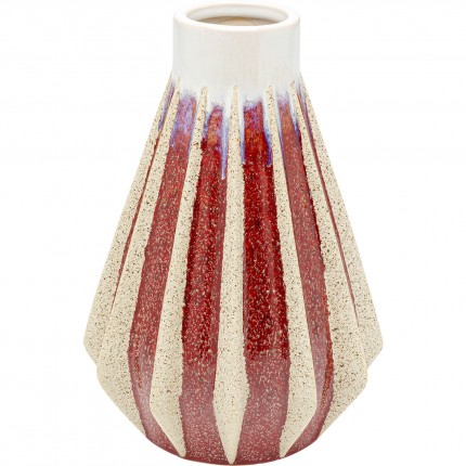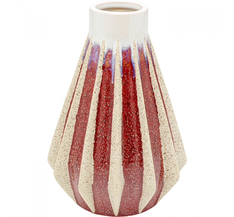 Deze vaas van steengoed trekt de aandacht naar boven, omdat de witte hals contrasteert met de rode basis, waarvan de rechte, verhoogde lijnen naar boven leiden.