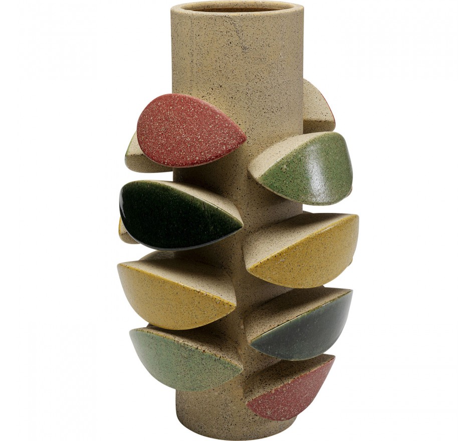 Deze vaas belichaamt de delicate harmonie van natuur en kunst. De randen zijn versierd met veelkleurige ovale stukjes in reliëf. Elk stukje lijkt uit het oppervlak van de vaas te komen en creëert een subtiel, organisch patroon dat de aandacht trekt en uitnodigt om aan te raken. Met zijn combinatie van texturen en kleuren wordt deze vaas zowel een elegant decoratief element als een rustig toevluchtsoord voor je favoriete bloemen.