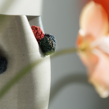 Deze vaas van steengoed heeft een originele opening. De kleurrijke pompons in reliëf zorgen voor een speelse, dynamische toets. Ideaal om frisheid en plezier toe te voegen aan je inrichting!