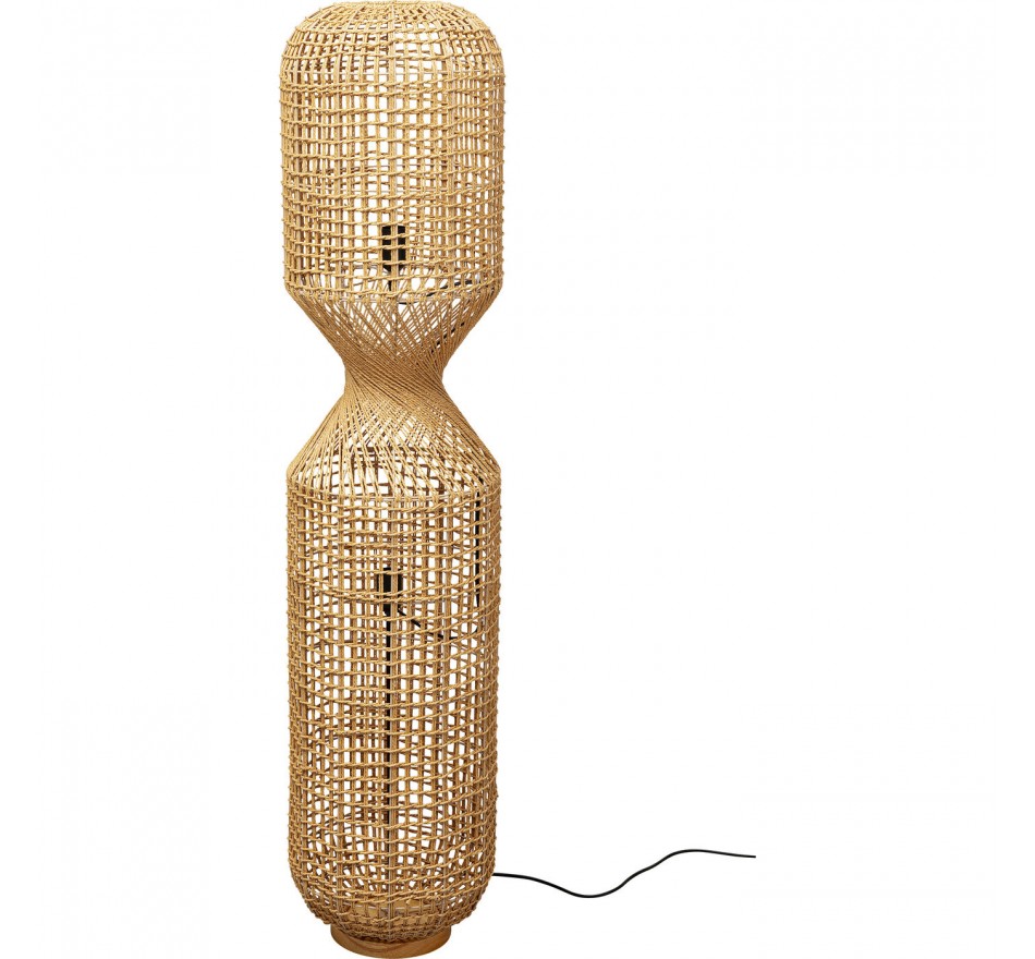 Laat je verleiden door de elegantie van deze gevlochten rotan vloerlamp met zandlopervorm, die je meevoert naar de zon.