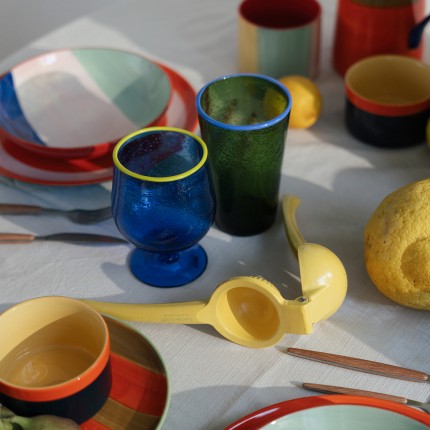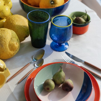 Geef je tafel een originele toets met dit unieke servies. Schalen, waterglazen en wijnglazen zijn verkrijgbaar in blauw of groen, versierd met delicate luchtbellen die in het glas zijn ingesloten en geaccentueerd met een rand.
