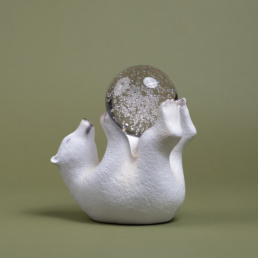 Deze decoratie toont een ijsbeer die op zijn rug ligt en speelt met een glazen bol die op zijn 4 poten balanceert.
