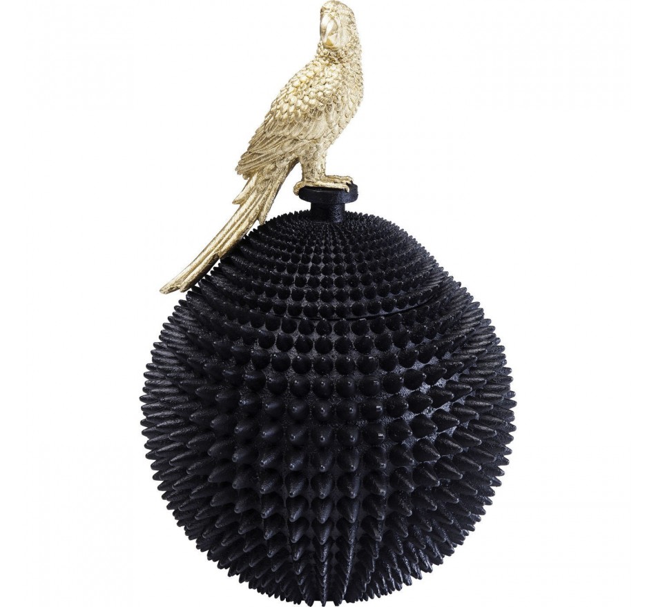 Ajoutez un air tropical à votre intérieur avec ce perroquet doré perché sur une boule noire piquante. Ce petit gardien veillera sur vos bijoux et autres trésors.
