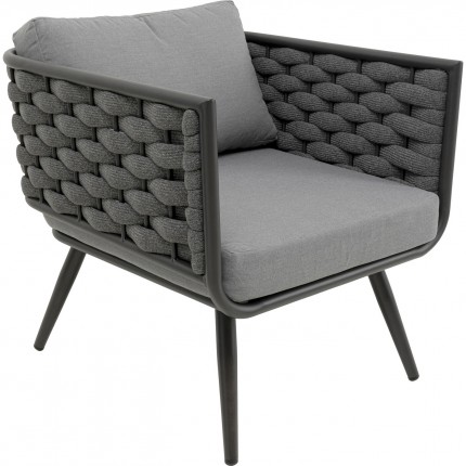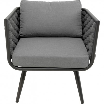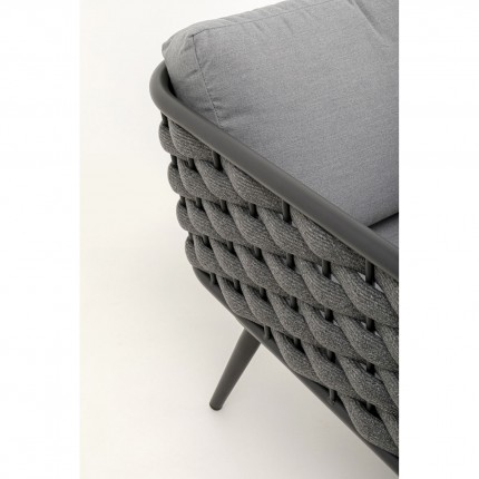 Ce salon de jardin se compose d'un canapé 2 places, de 2 fauteuils et d'une table basse. Ses assises sont mises en valeur par des bandes de tissu en coton à l’aspect tressé qui apportent du relief, le tout complété par son coloris gris anthracite pour un ensemble intemporel.