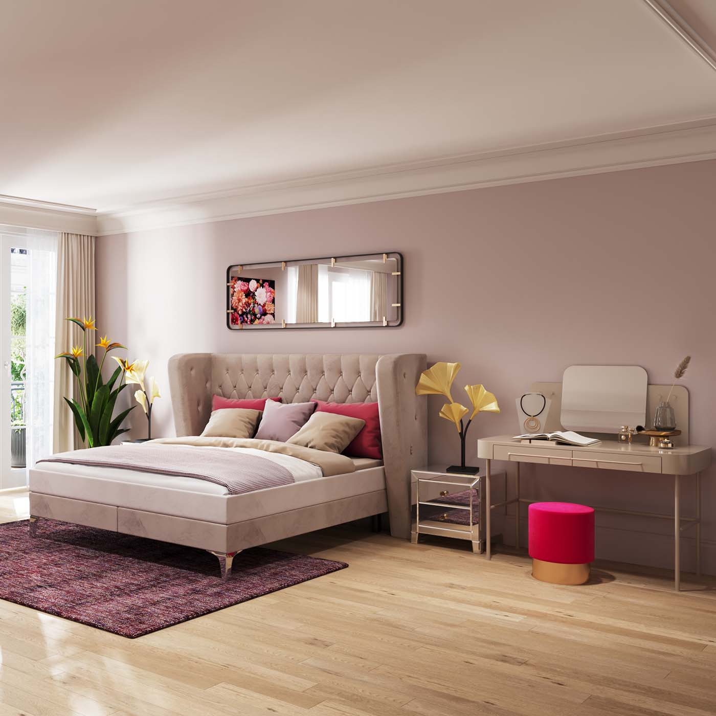 Ce chevet à l'esthétique moderne et raffinée est composée d'une structure en bois compressé laqué noir et de panneaux en miroir. Ses deux tiroirs s'ouvrent grâce à des poignées en verre qui rappellent des diamants.