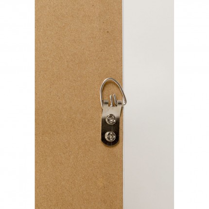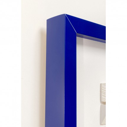 Ce tableau en relief met en avant des triangles en bois qui forment un grand rectangle, le tout sur un fond en tissu entouré d'un cadre bleu qui apporte du peps.