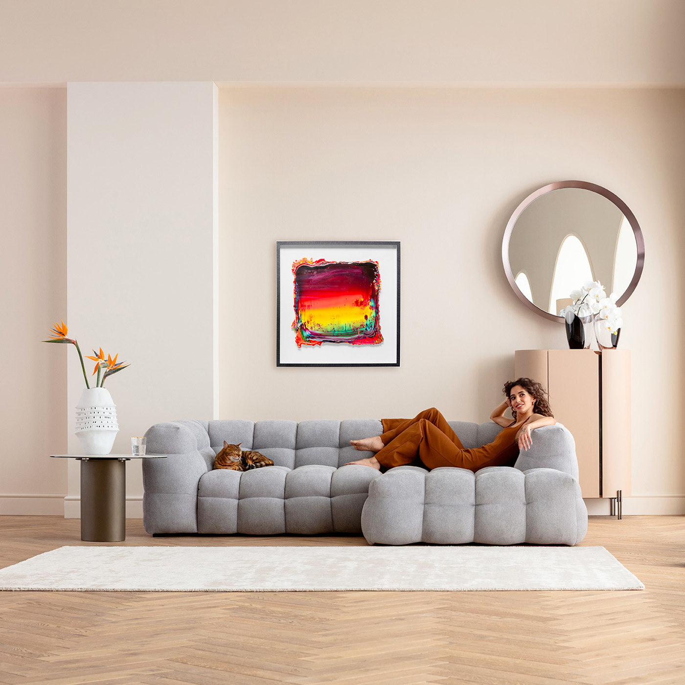 Apportez chaleur et énergie à votre intérieur avec cette peinture abstraite encadrée, aux dégradés vibrants de rouge, jaune et vert. Ses textures irrégulières et sa profondeur visuelle en font une pièce unique, parfaite pour sublimer un espace moderne avec audace et élégance.