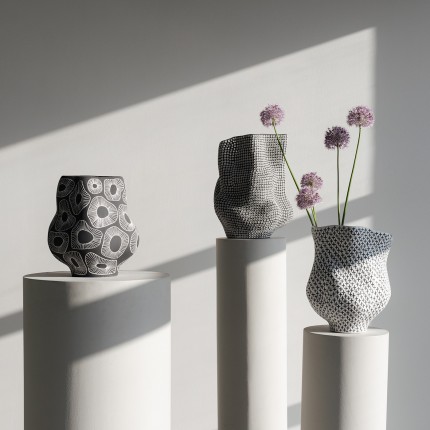 Ce vase blanc, en forme d'anémone, parsemé de petites croix noires, est prêt à faire sensation ! Il combine la douceur de la mer et le style graphique, un peu comme si l'art et la nature avaient décidé de fusionner.