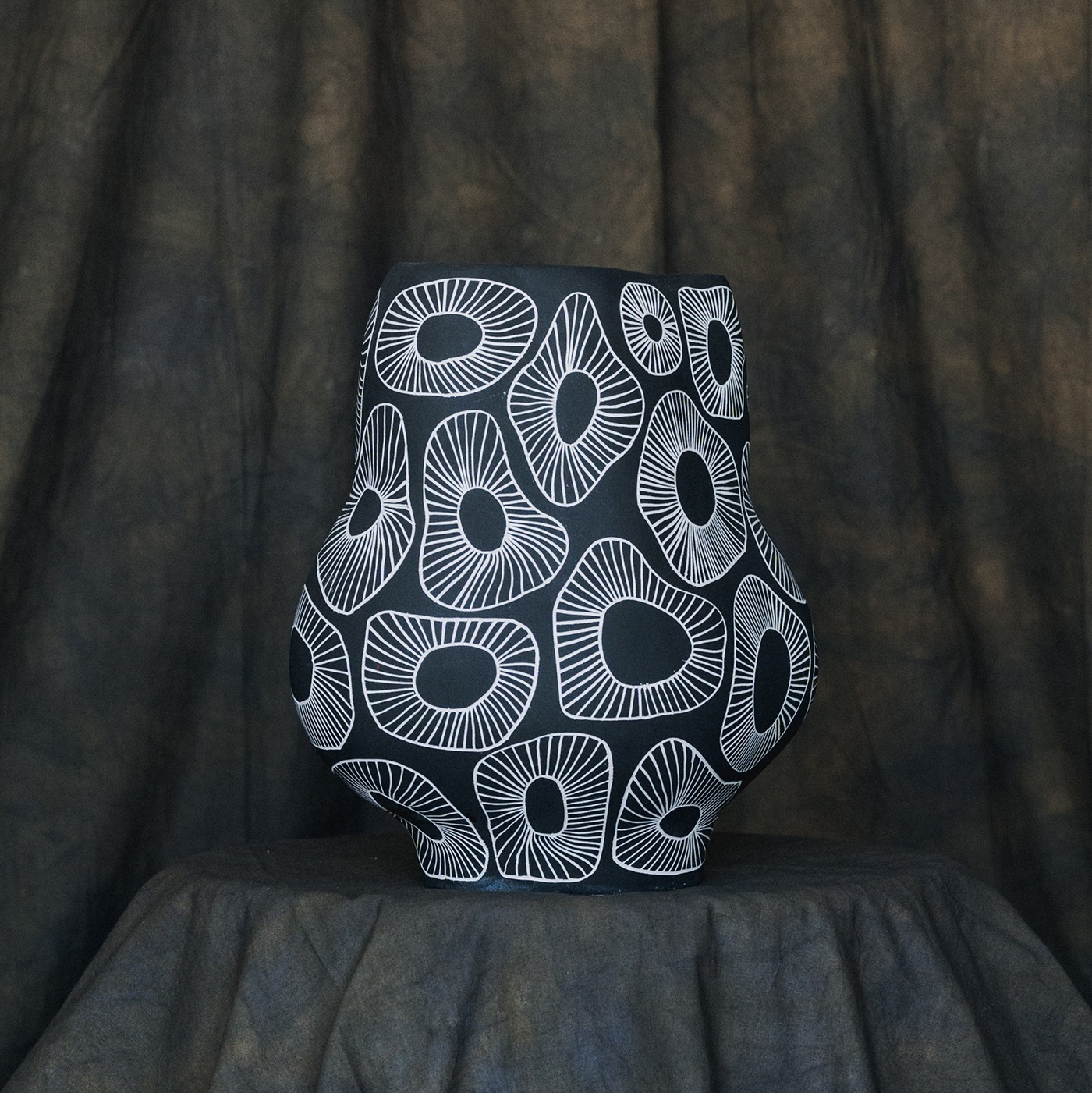 Ce vase gris se distingue par sa forme organique et ses dessins en forme d'anémones blanches abstraites.